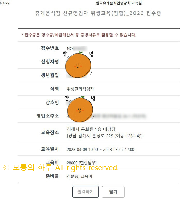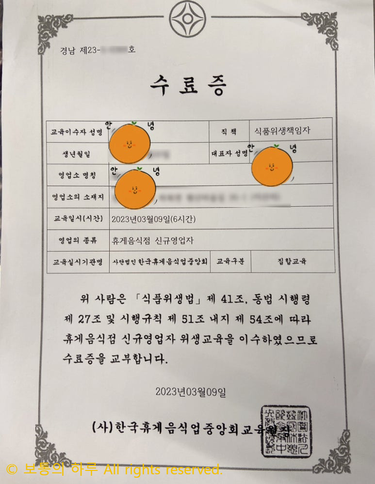 오전 10시부터 오후 5시까지 위생교육 잘 받으니 수료증은 현장에서 바로 배부 해줬어요.
