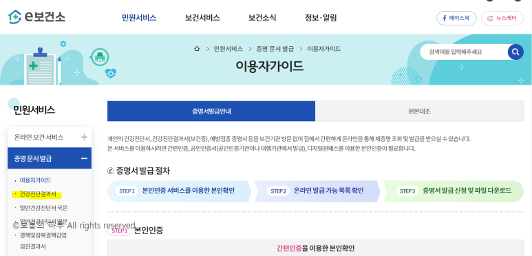 보건복지부와 한국사회보장정보원이 운영하는 온라인민원 서비스,건강진단결과서(구 보건증) 등 제증명 발급, 의료비지원 등 안내
